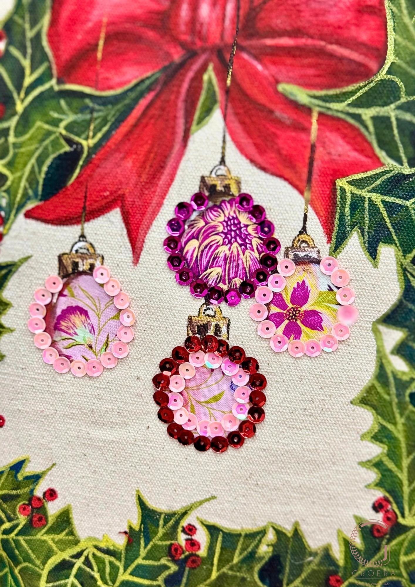 Bring on the festive vibes with this hand-painted canvas tote! Featuring a lush holly wreath, a big red bow, and sparkly pink ornaments, it’s full of Christmas cheer. Durable leather straps and a one-of-a-kind painted design make it both stylish and practical — perfect for holiday shopping or gifting! ❤️